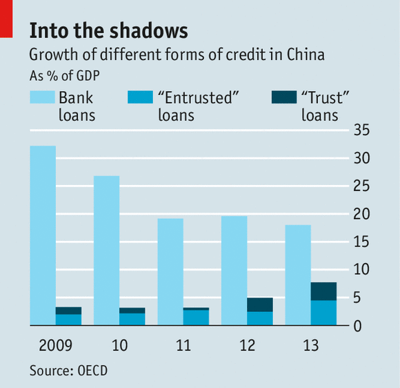 A decade ago, conventional banks, which are almost all state-owned and tightly regulated, accounted for virtually all lending in China. Now, credit is available from a range of alternative financiers, such as trusts, leasing companies, credit-guarantee outfits and money-market funds, which are known collectively as shadow banks. Although many of these lenders are perfectly respectable, others constitute blatant attempts to get around the many rules about how much banks can lend to which companies at what rates.