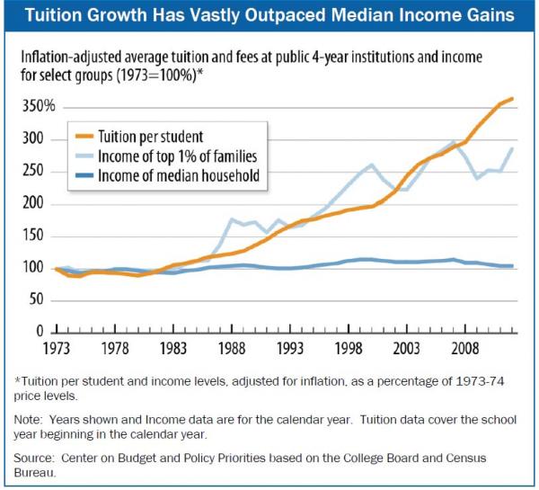 Since in America one now needs a Bachelor’s degree (if not a PhD in economics, of course) to get a job as a waiter, according to the following chart the US may soon have a severe waiter shortage considering the cost of college tuition has outpaced even the income of the 1%. As for everyone else, forget it – want that French Polynesian belly-dancing major? Prepare to become a debt slave for life.