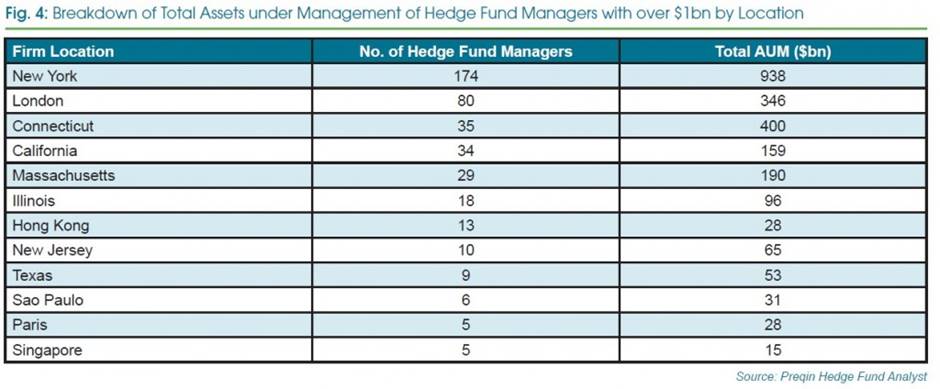 London is home to the second highest number of $1bn plus managers (80), although Connecticut is second in terms of capital managed by these firms with a combined total AUM of $400bn, largely as a result of the $157bn managed by Bridgewater Associates.
