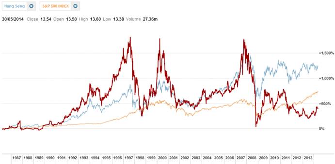 CITIC Pacific Vs Hang Seng Index and S&P500 – Stock Price Performance, 1986-2014 CITIC Group, China’s largest state-owned conglomerate by revenue, made news in March on plans to list in HK by reversing into its HK-listed unit CITIC Pacific (267 HK, MV $7.9bn) in a parent-to-child asset injection transaction worth $36bn, the biggest-ever public market asset transfer in Chinese history. Rather than relinquishing control, in the short term CITIC Group could raise its stake in CITIC Pacific from 57.5% to close to 90%. Sovereign wealth funds China Investment Corp and Singapore’s Temasek Holdings are said to be approached about buying into the offering.However, an alarming piece of news broke out in mid-May that cast a shadow on the back-door listing deal that the market loved. CITIC had invested more than $50bn in shadow banking products over the past three years. Its “maximum loss exposure” to wealth management products (WMPs) and other non-standard higher-yielding investments reached RMB322bn ($52bn) at the end of 2013, 36 times higher than its 2011 exposure of RMB9bn. CITIC Group is also an active conduit for the sale of WMPs and other non-standard credit instruments, selling RMB976bn on behalf of third-party issuers last year. China’s largest bank ICBC had sold RMB1.1tr. To understand the potential implications of the CITIC deal, perhaps we need to go back to the winds of history that were howling around Tiananmen and CITIC…