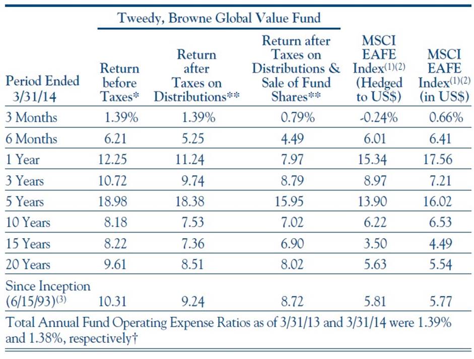 Looking back over 2013, it would be hard to conclude that it was anything other than a banner year for equity markets in much of the developed world. Japan was the hands down winner, apparently based on the assumption that Prime Minister Abe had a winning formula, although since the turn of the year some doubts seem to be creeping into that previously held conviction. (We refer you to our October 2013 letter (available on www.tweedy.com) for our view on Japan, which has changed very little since then.) European markets produced large stock market gains despite the fact that their underlying economies eked out by most measures only very modest gains.