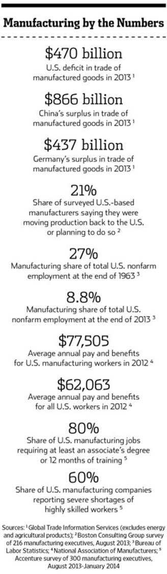 Driven partly by more competitive labor and energy costs and companies’ desire to produce goods closer to their customers, the number of factory jobs has started to rise after plunging for decades, edging up by about 600,000 over the past four years to more than 12 million. Some U.S. companies are bringing jobs back home, and foreign businesses are setting up shop. Newspapers are trumpeting investments in American production, and advertisements—such as the nostalgia-drenched Chrysler TV ad shown during the Super Bowl and featuring Bob Dylan —celebrate a resurgent U.S. manufacturing sector.