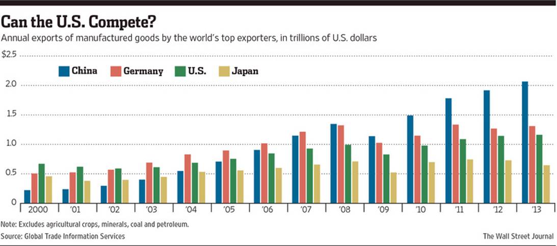 Critics also point to some other numbers that aren’t so rosy. Trade figures, for instance, don’t back up the idea that the U.S. has become much more competitive. U.S. manufacturing exports—excluding agricultural items, petroleum and coal—rose just 1.6% last year to $1.16 trillion, according to data from Global Trade Information Services Inc., a Geneva-based data provider. China’s manufacturing exports increased 7.7% to $2.06 trillion. Meanwhile, U.S. imports of manufactured goods also grew 1.6% last year, reaching $1.63 trillion.