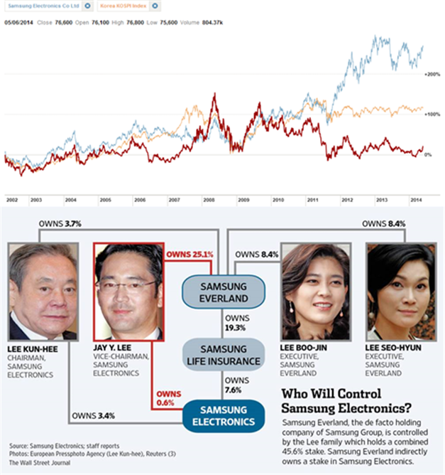 The “Chaebolution” movement – the transition towards meaningful restructuring for the diversified Korean conglomerates with complex circular shareholdings – is marking its most significant event last week. Samsung Group announced that Samsung Everland, which sits at the apex of an intricate web of circular shareholding, is going for listing and conversion into the Group’s holding company by early next year. Such spider web shareholdings is said to fester self-dealings, tunneling and expropriation activities by the controlling shareholders at the expense of long-suffering minority shareholders, resulting in the “governance discount” for Korean shares. With the listing, Samsung Group affiliates could account for over 30% of the market value of all listed companies in Korea. We like to argue that until a business group has gone through its own “chaebolution”, investors mechanically using sum-of-the-parts (SOTP) valuation method in summing up the imputed values of individual segments will be overestimating the enterprise value for conglomerates. This is because managers have incentives to manipulate and transfer earnings from segments operating in industries with lower valuation multiples to those with higher multiples, as doing so will lead to higher equity valuations. Compared to firm-level earnings, segment-level reports often involve more managerial discretion and are subject to less auditor scrutiny. To understand the implications of Samsung Group’s conversion to a holding company structure as part of the “forced refocusing” theme in Korea and Asia, we need to travel back twenty years ago with Samsung’s chairman Lee Kun-hee in his Porsche.