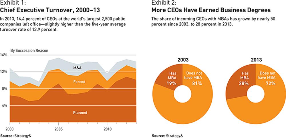 In 2013, CEO turnover at the largest 2,500 public companies in the world was mostly business as usual. Just 14.4 percent of CEOs left office, a small decrease from the 15 percent in 2012 but a slight increase over the five-year average of 13.9 percent. The share of planned turnovers—as opposed to those in which CEOs were forced out or left because of an M&A transaction—reached just more than 70 percent in 2013, similar to the share of planned turnovers since 2010 but nearly 20 percent higher than the share between 2000 and 2009.