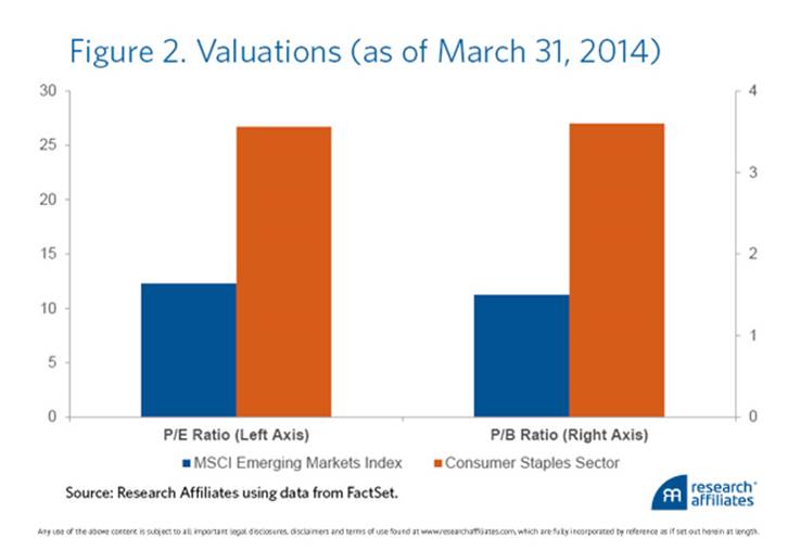 The exciting popular story has been the growth of the emerging markets consumer who has seen a rapid rise in wealth and income. Consumer-related stocks have been one of the top performing emerging market sectors over the last three years, up 26% in absolute terms and beating the broad market by 33%. Investors’ upbeat expectations are reflected in sky-high valuations. The consumer sector is trading at a 27x price-to-earnings (P/E) ratio and a price-to-book (P/B) of 3.6x, both more than twice the corresponding measures for the broad emerging market index (see Figure 2).5Ironically, investors who are worried about slowing growth in China and other emerging markets are paying premium prices for companies whose earnings may be the most at risk.