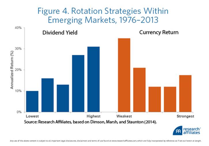 Writing in the Credit Suisse Global Investment Returns Yearbook 2014, Elroy Dimson, Paul Marsh, and Mike Staunton modeled a series of rotation strategies within emerging markets.6 For example, rotating out of low dividend yielding countries and into high yielding countries would have increased annualized returns by about 20% over the 38-year period from 1976 to 2013. Buying countries with the weakest currencies would also have added value by about the same amount. Figure 4 displays the hypothetical rates of return resulting from annually sorting countries into dividend and currency quintiles over the measurement period.