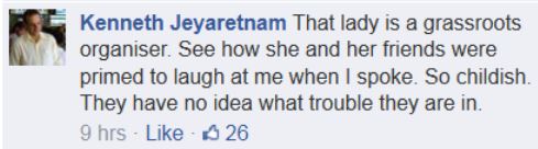 Opposition member, Kenneth Jeyaretnam, was at the dialogue session yesterday. According to Kenneth, the cheongsam lady is a grassroots leader. In fact, Kenneth complained that the cheongsam lady and her friends disrupted him with laughter when he spoke: