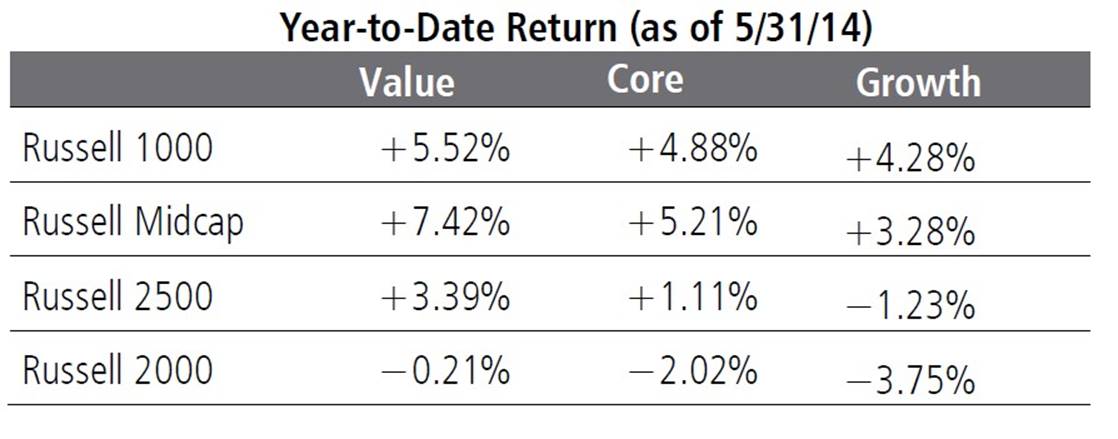The U.S. stock market has performed erratically in 2014. For instance, both the S&P 500 and the Russell 2000 fell more than –2.5% in January but recovered to gain more than +4.5% in February. In April, the large-cap S&P 500 gained +0.74%, while the smallcap Russell 2000 lost –3.88%. It was tough to tell what the market was saying earlier this year, but now it is becoming more clear. While equity investors do not seem to think the economy is contracting, their confidence in the economic recovery’s power has