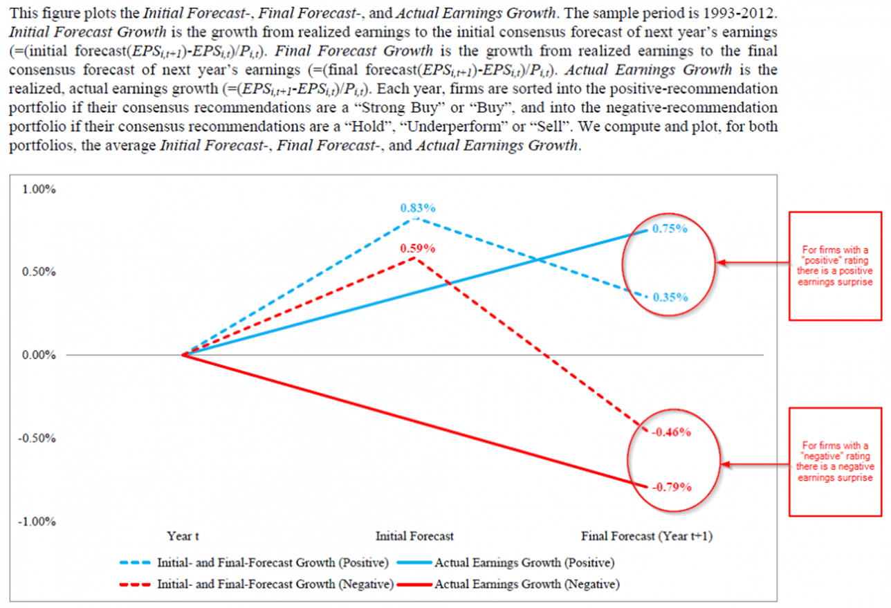 The paper documents that analysts with a bullish recommendation walk down their EPS growth estimates (creating a positive surprise). For analysts with a bearish recommendation, EPS growth estimates are too high (creating a negative surprise). The paper shows this in the figure below: