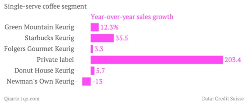 To be clear, this “piracy” is not illegal, and in fact private labels are by far the fastest growing segment of the single-serve market, dramatically outstripping Keurig’s own brands and high-profile partner companies such as Starbucks. Private-label market share has grown to 9.3% of the total, according to a Credit Suisse research report. And private-label sales growth has been absolutely spectacular over the last year:
