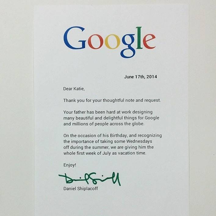In a letter back to Katie, her dad’s boss, Senior Design Manager Daniel Shiplacoff, not only complimented Katie’s dad on his hard work, but also gave him a bonus week off. Since it is summer, after all.
