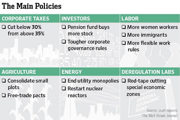 “We made political compromises,” Hiroshige Seko, one of Mr. Abe’s top advisers, told The Wall Street Journal in an interview Monday. “We’re emphasizing execution, even if the plan gets a score of 80, instead of 100.”