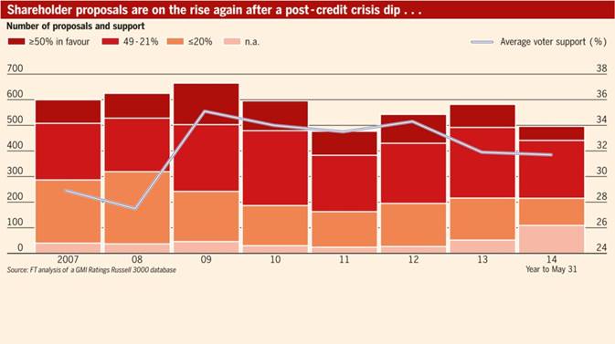 The FT examined GMI Ratings data covering eight years of activity among the Russell 3000 index of US-listed companies. It shows that 321 last year faced 582 proposals, up from a post-crisis nadir of 477. With more than three-quarters of annual meetings passed, 2014 shows rising volumes and breadth of activism, with many companies acceding to proponents’ demands before they can reach a vote.