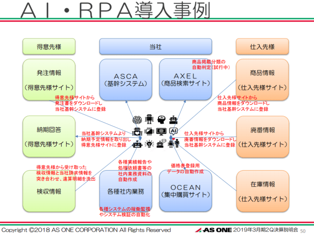 AS ONE has also adopted artificial intelligence X robotic process automation (AI x RPA) to increase its efficiency and margins as it scales up. Medical institutions, hospitals and researchers “have various specialized needs, such as they want a tool and equipment that can make the experiment in a vacuum state or under zero gravity. Our strength is to deliver these products seamlessly and speedily”, commented CEO Takuji Iuchi, the third-generation business leader. Because the product is low volume-high-mix in nature, or small in quantity and many types, customer interface, inventory & logistics management and business process integration are the critical backbone systems of the company. The intelligent automation of this backbone through AI X RPA has given AS ONE an exponential edge to improve the quality and speed in responsiveness to their customers.