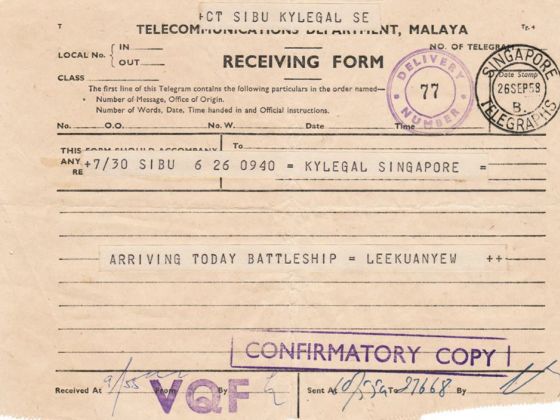 Dated Sept 26, 1958, the late Mr Lee, who was practising as a lawyer in Lee & Lee then, simply wrote “ARRIVING TODAY BATTLESHIP = LEEKUANYEW”. PM Lee shared that his father had intended to inform the family that he will be expected home from Sibu, Sarawak, and that he’d wanted to have steam boat for dinner that night.