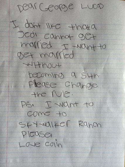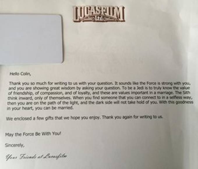 A letter sent to Lucasfilm from one of its fans, Colin. A letter sent from Lucasfilm to its fan Colin. Read more of this post