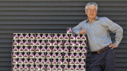 Dick Smith with a pallet load of his Australian grown sliced beetroot. Photo: Ben Rushton
